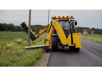 Deze zware armklepelmaaier is geschikt voor trekkers vanaf 100 pk, maar belangrijker is een minimaal gewicht van 6500kg en een CAT 2 breedte fronthef. De klepelarm is uniek in zijn soort door zijn aandrijving, bereik en werkbreedte. Ook kan de klepelarm hydraulisch naar achteren draaien dat tevens de aanrijbeveiliging is. De aandrijving van de klepelbak gebeurd met de 1000rpm aftakas, er zitten 3 zware V-snaren naast elkaar langs de giek aan beiden kanten. Deze brengen de pk's van de trekker zo rechtstreeks naar de klepelbak met minimaal verlies, geen hydrauliekpompen en/of motoren. Het bewegen van de machine gebeurd door 4 dubbelwerkende ventielen rechtstreeks op de trekker, dus geen extra elektronica en/of ventielenblokken. Er zit hydraulische bodemdruk ontlasting op door middel van een accumulator die je onder druk zet. De machine is uit te voeren met een 2,1m brede hamer klepelbak of een 2,1m brede ketting maaier. Voordelen van de ketting maaier zijn met moeiteloos omver maaien van dik opschot, geen zuigende werking zoals een klepelbak en geen scherpe messen. Het voordeel van een klepelbak is dat hij netter werk levert. Door het contragewicht van 700kg hangt de machine stabiel achter de trekker zonder extra stabilisatie. Het bereik is 5,2m vanuit het hart van de trekker tot de buitenkant van de klepelbak. Een prima combinatie met een 5,2m of 7,2m uitvoering achter de trekker!